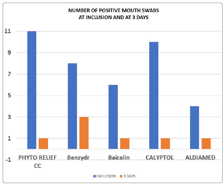 Figure 1: The decrease in positivity in the swab samples. The use of ‘virucidals’ resulted in a significant level of complete disappearance of positivity in most subjects. All virucidals were effective. Phyto-relief produced the longest virucidal action due to a slower release of its components.